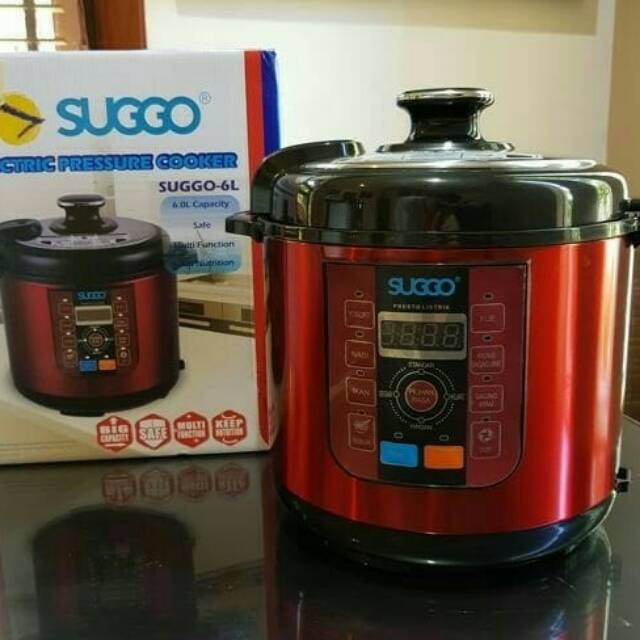 SUGGO Electric Pressure Cooker - Alat masak/presto SerbagunaSuggo Presto Listrik adalah alat yang memudahkan dan mempercepat proses memasak. Praktis, hemat listrik, ekonomis, aman digunakan sehari-hari. Mempercepat proses memasak bahan makanan yang membutuhkan waktu lama, seperti ketupat, rendang, sup buntut, iga, gudeg, rawon, maupun untuk memproses masakan sehari-hari seperti sayur asam, bubur ayam, dll.Keunggulan Suggo Presto Listrik- Alat masak serbaguna dengan fungsi; presto, slow cooker, rice cooker, oven, dan yogurt maker- Terdapat menu sesuai dengan bahan makanan (ikan, daging, ayam, kacang-kacangan, sup, bubur, kue, nasi, yogurt)Praktis dan mudah digunakan, tinggal tekan menu sesuai yang diinginkan- Hemat waktu memasak dan dilengkapi timer untuk waktu tunda, memungkinkan alat memasak secara otomatis pada jam yang telah diatur (tidak perlu ditunggu).- Memiliki sistem pengaman dimana panci akan terkunci saat tekanan tinggi- Perawatan mudah dan tahan lama- Konsumsi energi /watt lebih rendah dibanding presto listrik lain- Harga terjangkau- Dilengkapi fungsi Keep Warm, sehingga menjaga masakan tetap hangat- Anti lengketKapasitas : 6 LiterBonus : Sendok Nasi dan Adaptor listrikBisa digunakan untuk memasak :- Nasi, Bubur- Sup- Daging/kacang-kacangan- Ayam- Ikan- Kue/Roti- YoughurtSpesifikasi :Daya : 500 watt Voltase : 220 volt Frekuensi : 50hz Kapasitas : 6 L Diameter : 22 cm Dimensi : 315 x 315 x 3