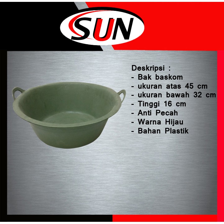 Deskripsi :- Bak Hijau- Diameter atas 42- Diameter Bawah 32- Tinggi 16- Anti pecah- Bahan Plastik- Warna Hijau- Cocok untuk tempat pakan ternak dan tambal ban-----------------------------------------------------------------------------------------------------------Salam,Sun Har