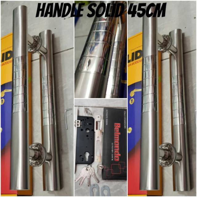 PAKET PINTU KUPU2Handle pintu stainless baut tembus merek SOLID panjang 45cmLebar handle 4,3cmSudah dilengkapi baut dan kunci LBerbahan stainless anti karat2 set = 4 gagang luar dan dalam1set body pelor comp key isi 4 anak kunci komp