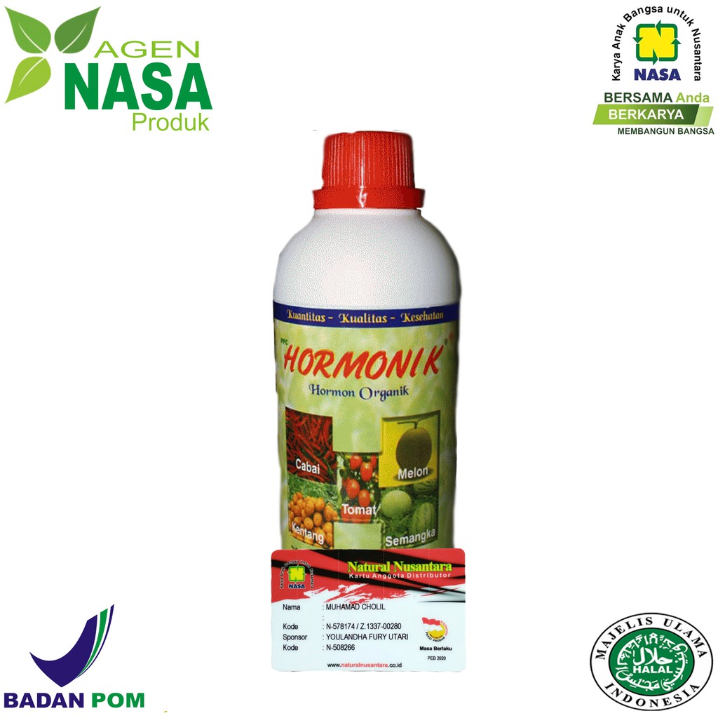 Agen Nasa Produk Merupakan Official Resmi PT. Natural Nusantara yang Menjual Produk Asli Original Nasa,HORMONIK adalah Zat Pengatur Tumbuh atau hormon organik salah satu produk pertanian unggulan produksi PT. Natural Nusantara (NASA). HORMONIK memacu pertumbuhan, pengumbian, pembungaan dan pembuahan tanaman untuk mendapatkan hasil panen optimal. HORMONIK mengandung Zat Pengatur Tumbuh (ZPT) Organik terutama Auksin, Giberelin dan Sitokinin, di formulasikan dari bahan alami yang dibutuhkan oleh semua jenis tanaman. HORMONIK tidak membahayakan (aman) bagi kesehatan manusia maupun binatang.Cara Pemakaian :1. Dosis : 1 2 cc HORMONIK per 1 liter air.2. Penggunaan lebih optimal jika dicampur dengan POC NASA ( dosis 1 ttp HORMONIK + + 3 ttp POC NASA ) per tangki.3. Penggunaan dengan cara disemprotkan terutama pada daun tanaman hingga merata.4. Tanaman semusim : mulai pertengahan usia tanaman hingga menjelang reproduksi, yaitu sebelum berbunga/ berumbi (3-6 kali semprot). Penggunaan semenjak awal tanam lebih baik.5. Tanaman tahunan : 2-4 bulan sebelum berbunga/berbuah ( 3-6 kali semprot).Jenis Pemakaian1. Untuk tanaman semusimGunakan mulai pertengahan usia tanaman sampai menjelang reproduksi. Yakni sebelum tanaman berbunga atau berumbi. Penyemprotan sebanyak 3-6 kali semprot. Lebih baik lagi digunakan sejak awal tanam.2. Untuk tanaman tahunan2-4 bulan sebelum tanaman berbunga atau berbuah. Penyemprotan dilakukan sebanyak 3-6 kali semprot.3. Untuk unggas / ternakGunakan sebanyak 1- 2 tutup botol Hormonik ditambah dengan 1 botol POC Nasa (500 cc) atau Viterna. Kemudian 1-2 cc campuran tadi dicampur dengan 1 liter air. Berikan ke ternak setiap hari satu