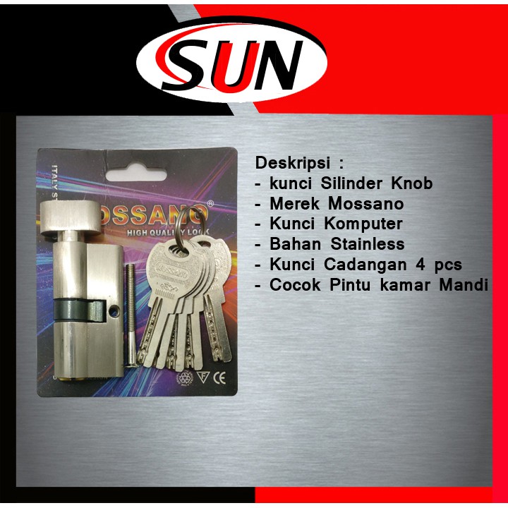 Deskripsi :- Kunci Silinder- Merek Mossano- Model KNOB- Bahan Stainless- Kunci Cadangan 4 pcs- Kunci Model komputer- cocok Pintu Kamar Mandi-------------------------------------------------------------------------------------------------------Kunci Body Mossano Memilki Kualitas silinder yang baik dari segi bahan dari stainless anti karat serta memilki kunci model komputer sehingga sulit di duplicate di tukang kunci sehingga aman.Salam,Sun har