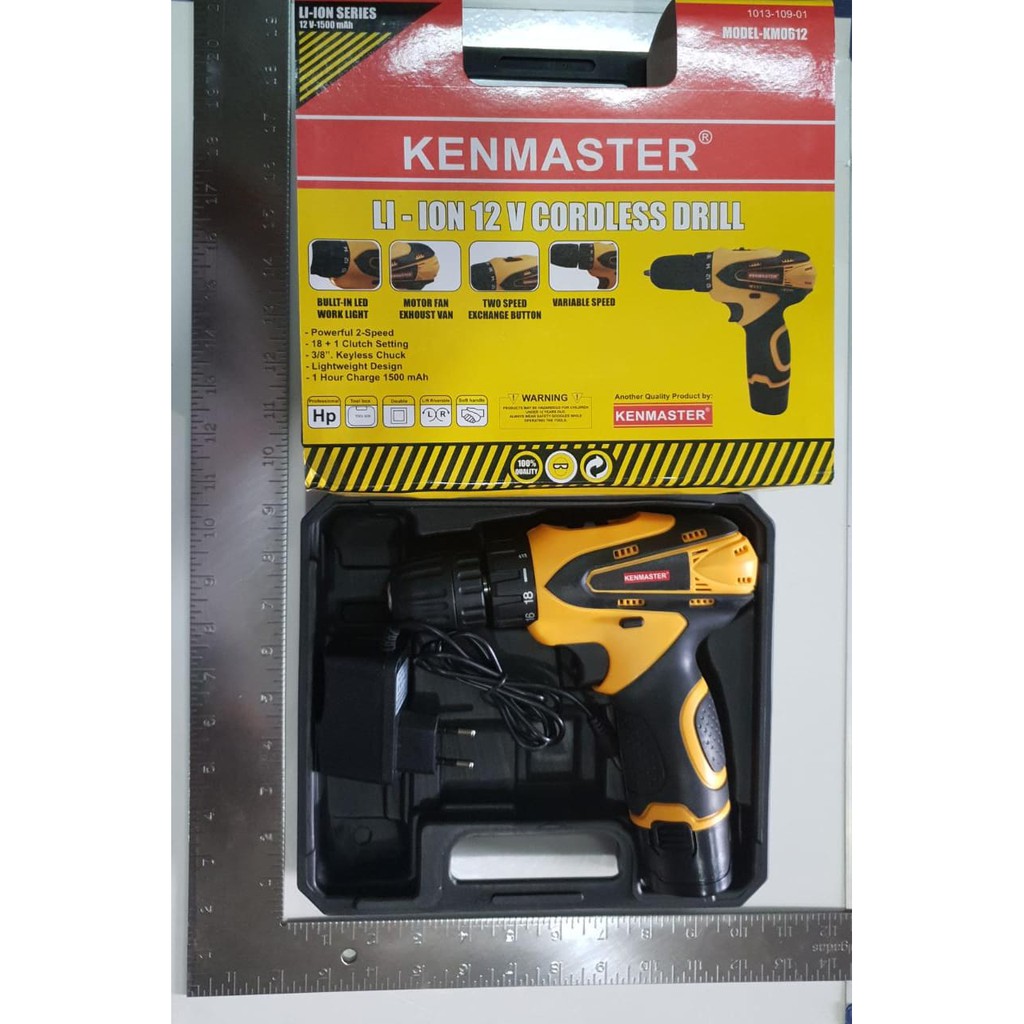 *Barang mengandung baterai, tidak bisa pengiriman keluar pulau. BILA TETAP MEMESAN, AKAN DIJALANKAN VIA POS BIASA (KAPAL LAUT). NO COMPLAIN NO RETUR.Pilih pengiriman via Wahana = CANCELMesin bor cordless Kenmaster 12V + Matabor fischer set KenmasterBuilt in LED worklightVariable SpeeDREVERSSIBLEMotor fan exhaust vanKapasitas baterai 1.500maHmax. 1.350 RPMSpek :Model : M-12vTegangan : DC 12VKecepatan tanpa beban : 0 - 760 r/Kapasitas bor kayu : 10 mmKapasitas bor besi : 10 mmKedalaman sekrup kayu : 4.5 x 20 mmJenis baterai : LI-ionKelengkapan produk :- Mesin Bor Baterai KENMASTER M-12v- 1 buah baterai- Charger-