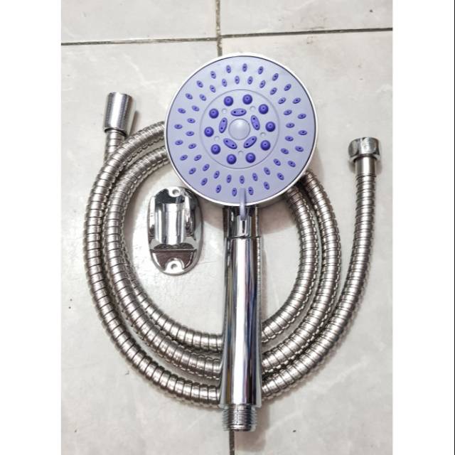 PROMO shower mandi murah 5spray (5 motif air) lengkap dengan selang 1,5mtr, gantungan shower dan sekrup fiser. Bahan kepala shower plastik ABS chrome. Bahan selang stain