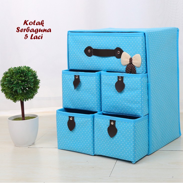 Kotak serbaguna bentuk laci, terdiri dari 3 susun 5 laci Bisa dipakai untuk tempat menyimpan pakaian dalam seperti bra atau celana dalam, pakaian bayi.Juga bisa dipakai untuk tempat pernak pernak aksesoris, kosmetik atau pernak pernik rumah. Sangat cocok untuk menyimpan barang-barang kecil agar tersimpan rapi dan mudah dicari saat dibutuhkan.Bukanya dengan ditarik keluar seperti membuka laci.Bahan cukup tebal, dalamnya terjahit lapisan karton tebal, bisa berdiri kokoh.Material : Kain kanvas lapisan karton tebalSize : 30 x 22 x 38 cm.#kotakpenyimpanan #kotakpenyimpananbox #kotakpenyimpananserbaguna #kotakpenyimpananmainan #kotakpenyimpananplastik #kotakpenyimpananbaju #kotakpenyimpananpakaian #kotakpenyimpananorganizerbag #kotakpenyimpananikea #kotakpenyimpananboxorganiz
