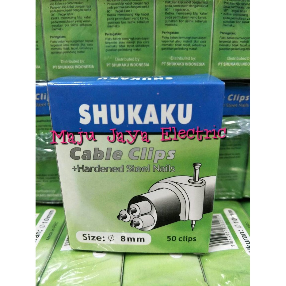 Klem Kabel Shukaku 8mm + Paku Beton Anti KaratHarga diatas Per Bungkus @50pcs.- Ukuran : 8 mm- paku Beton asli Anti Karat-biasanya dipakai untuk ukuran kabel 2x0.75 dan kabel antena tv 5C-Mutu Dan Kualitas terjamin..*Pengiriman wilayah Jakarta dan sekitarnya direkomendasikan menggunakan kurir GO-JEK/GRAB*Harap cek jam operasional kurir GO-JEK/GRAB yg dipilih sebelum berbelanja*Pengiriman GO-JEK/GRAB akan diproses dari pukul 08.00 sampai pukul 16.00*Untuk GO-JEK/Grab, pemesanan lebih dari pukul 16.00 maka pengiriman paket dilakukan pada hari berikutnya*Barang sudah dipacking rapih dan Safety (kami yg tentukan jumlah bubble atau kardus tergantung jarak dan barangnya)*Pengiriman dengan Kurir JNE, J&T ,dan TIKI menggunakan bubble + (plastik /kardus) dari kami~Selamat Berbelanja