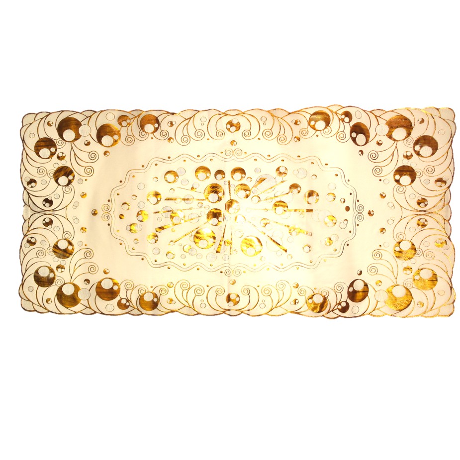 Taplak Meja TamuModel : SEGIUkuran 86 x 38 cmMotif : marbleBahan : Vinyl / PlastikWarna : dasarnya putih, detailnya coating emasUntuk meja Tamu ukuran Sta