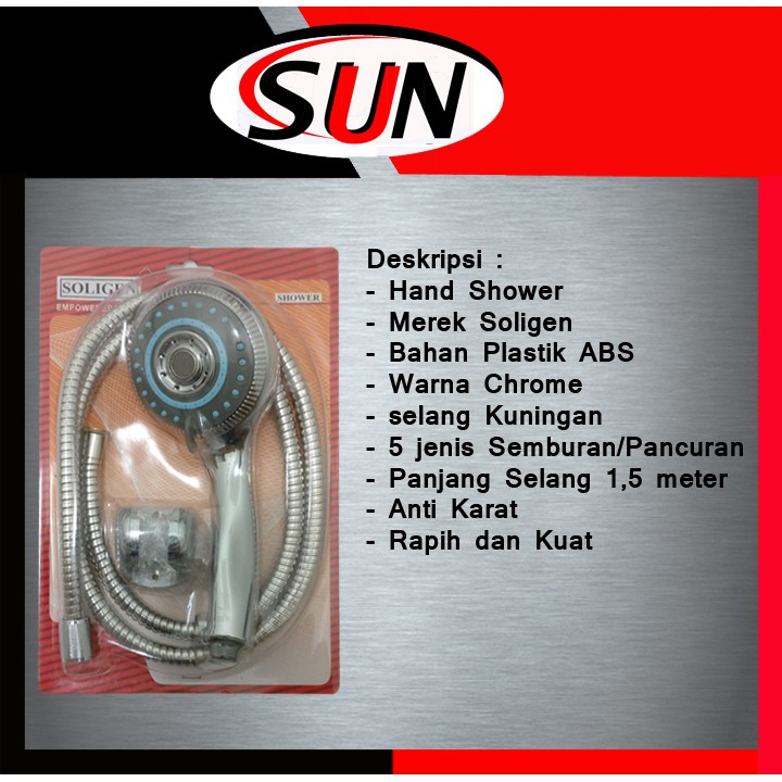 Deskripsi :- Hand Shower- Merek Soligen- Panjang Selang 1,5 Meter- Bagian dalam Selang kuningan- Warna Chrome Stainless- 5 Jenis Pancuran Atau Semburan- Bahan Kuat dan Rapih---------------------------------------------------------------------------------------------------Showe Soligen Memiliki kualitas yang premium dari segi bahan menggunakan kuningan sehingga anti karat untuk drat sambungan juga terbuat dari stainless sehingga kuat. memilki 5 mode semburan yang berbeda sehingga cocok untuk perlengkapan kamar mandi anda.Mau Cari Barang Lain Silahkan Mampir Ke Lapak Kami BosSs Disini Linknya.....****SUN HARDWARE****www.Shopee.co.id/sunhardwareSalam,Sun Har