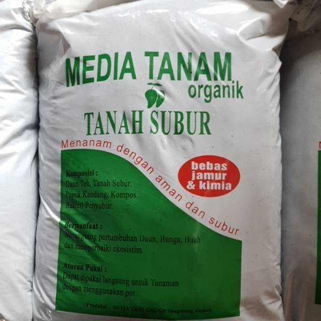 Media Tanam tanah SuburPakai gojek sameday pembelian max 2Pakai gojek instan pembelian max 5Komposisi : daun teh, tanah subur, pupuk kandang, kompos, bakteri penyubur.Manfaat : merangsang pertumbuhan daun, bunga, buah dan memperbaiki ekosistim.Aturan pakai : dapat di pakai langsung untuk tanaman dengan menggunakan pot.Note:Dalam melakukan order di harapkan memilih KURIR GOJEK INSTAN karena berat -+1